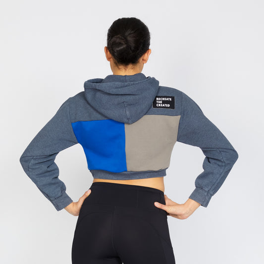 Crop Hoodie Sweatshirt in Blue, Black, Grey & Red Patch (S)
