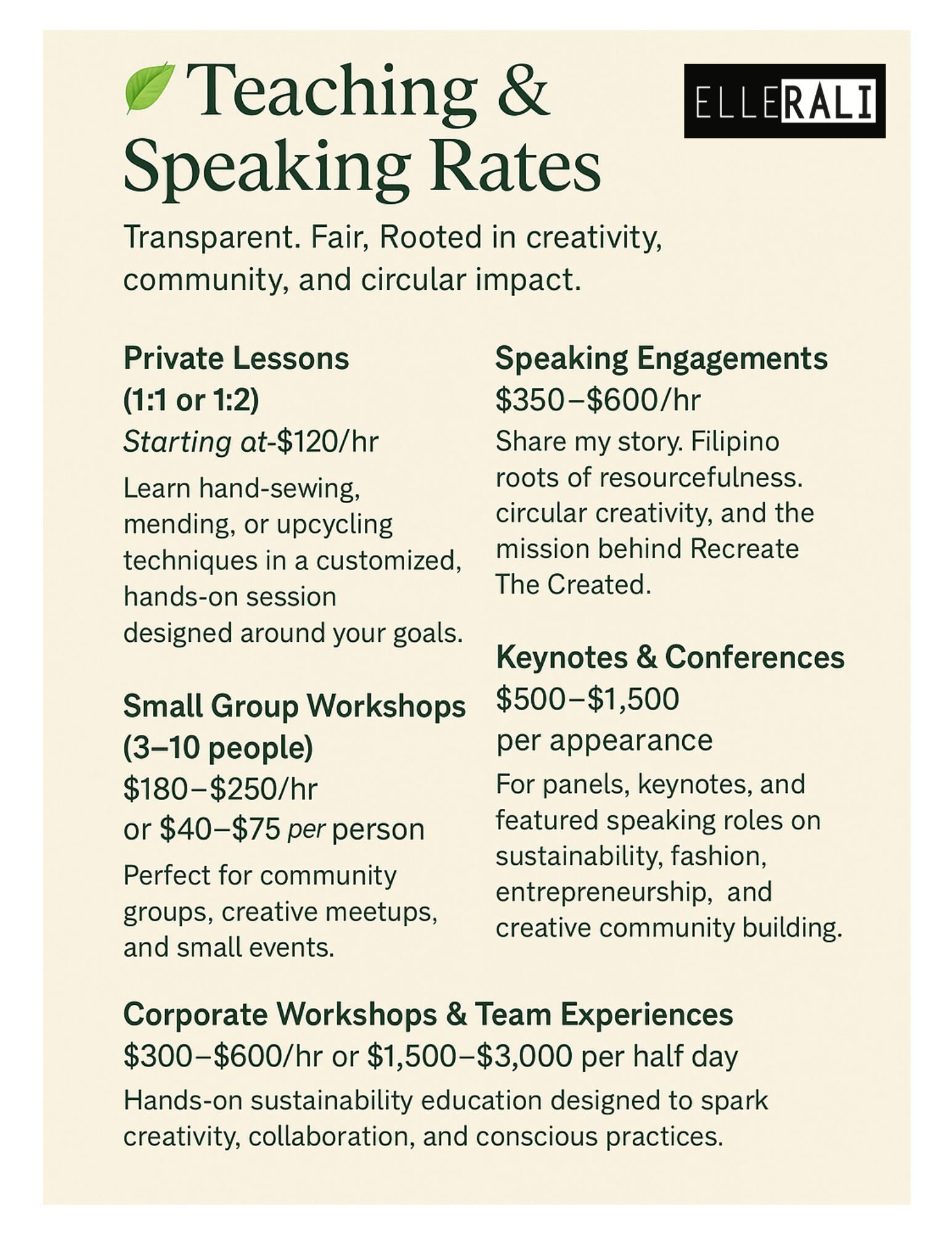 I offer private lessons, group workshops, school programs, panels, and talks rooted in sustainability, creativity, and community.