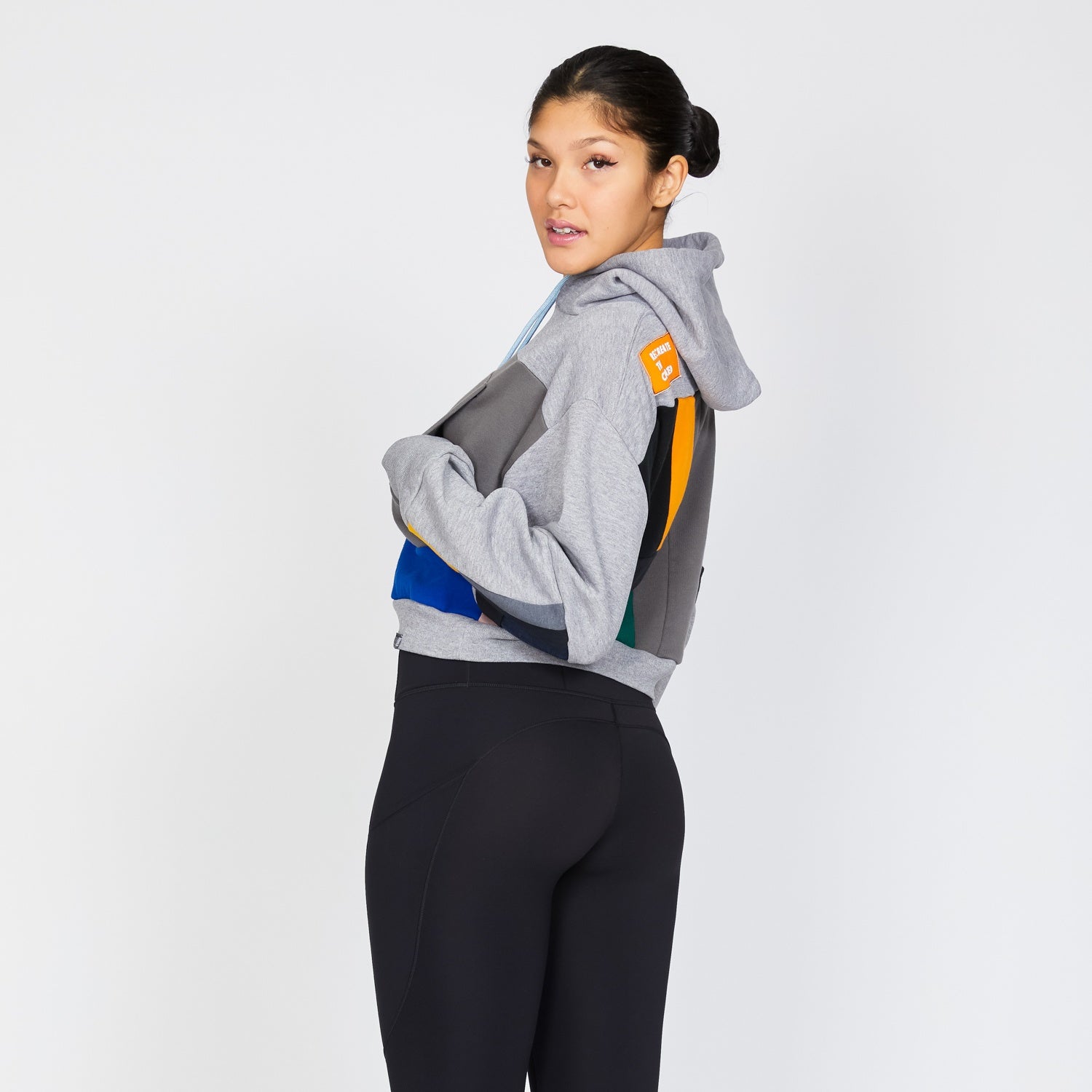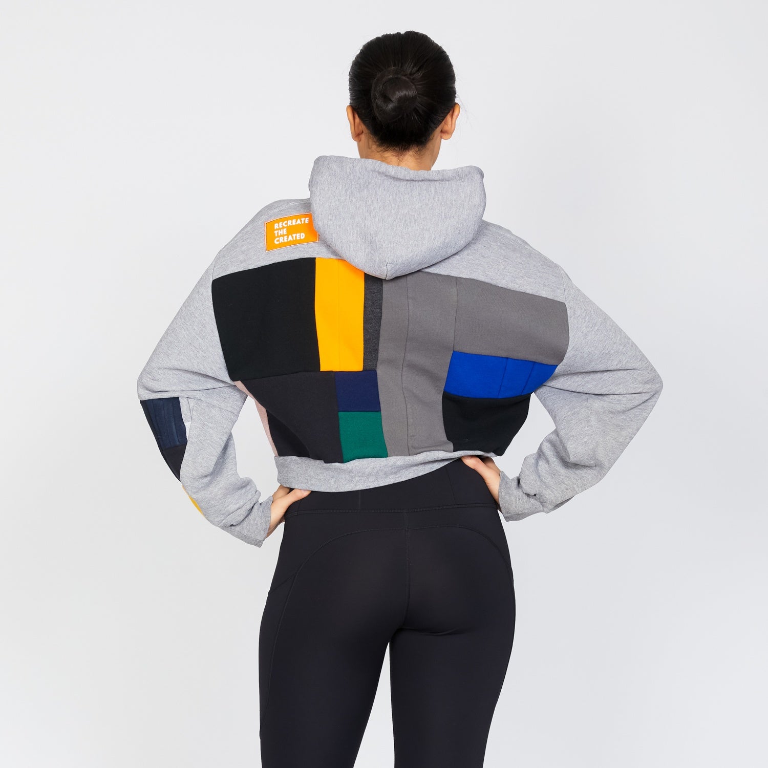 This one-of-a-kind crop hoodie is handcrafted from upcycled garments. A unique color way only for you! Cozy and comfortable, this sustainable sweatshirt is perfect for those looking for a functional and stylish eco friendly piece for their wardrobe.